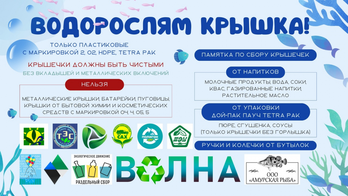 Амурский ЦСМ Росстандарта участвует в региональном проекте «Водорослям крышка», которое проводит вот уже не первый год подряд ГБУ Амурской области «Экология» на территории Амурской области! Собранные пластиковые крышечки будут направлены на вторичную переработку, а на вырученные средства будут закуплены и выпущены мальки растительноядного вида рыб – сазанов, которые активно поедают водоросли, после чего водоемы становятся чище.